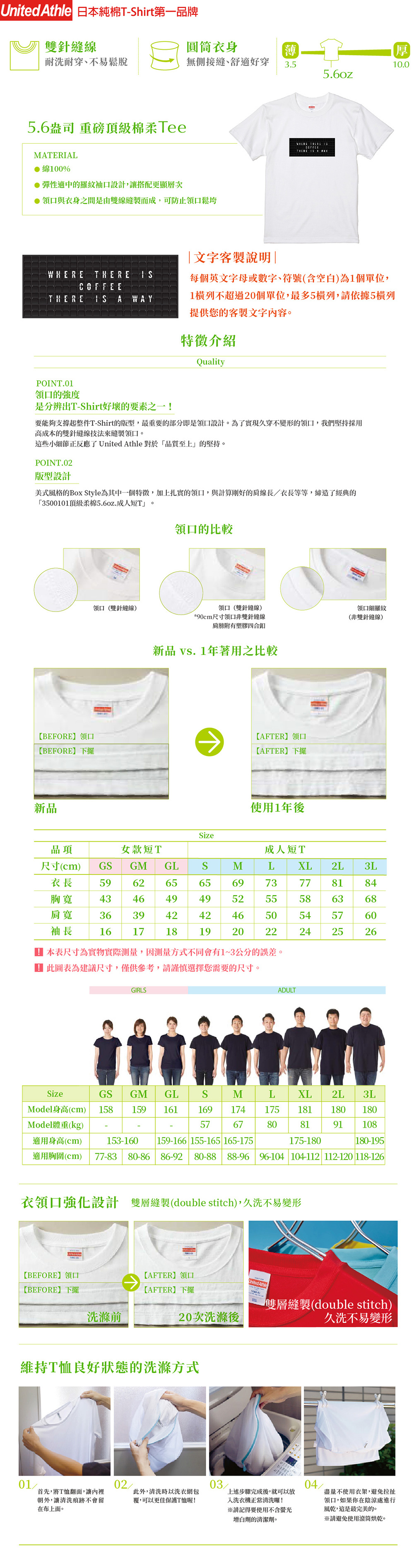 日本品牌 United Athle 的高品質100%純棉T恤,搭配客製化的文字印花,盡情表達自我,塑造獨特風格。
