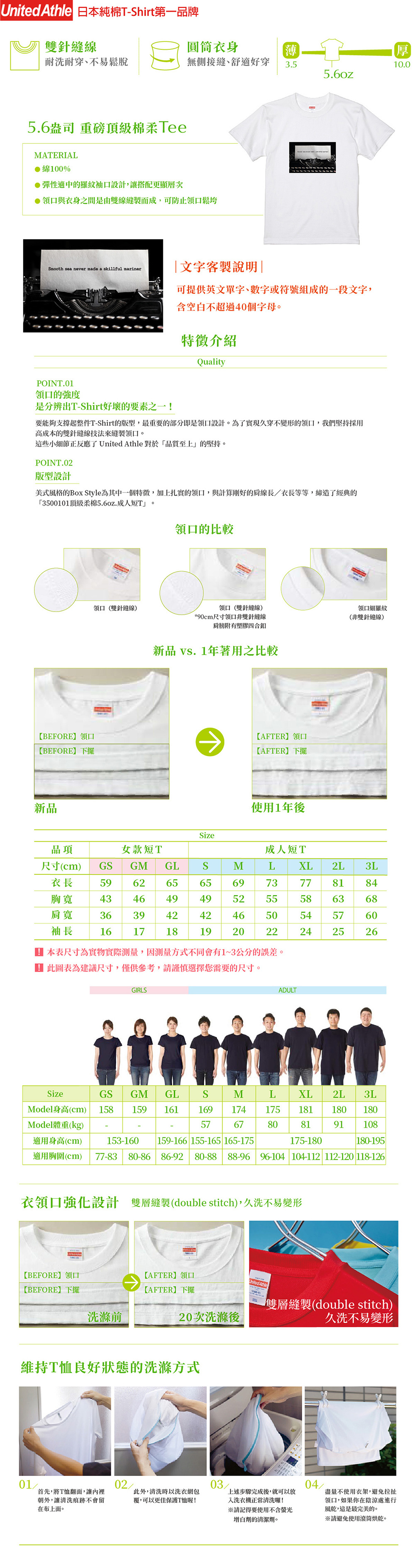 日本品牌 United Athle 的高品質100%純棉T恤,搭配客製化的文字印花,盡情表達自我,塑造獨特風格。